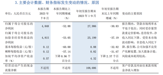 报告期内,贷款市场利率水平处于低位,同时受存量贷款重定价影响,息差收窄,净收入同比下降。受资本市场波动影响,非息收入同比下降。报告期,公司加强不良资产化解处置,加大拨备计提,风险成本耗用较高。