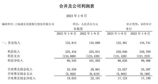 从浦发银行三季报来看,前三季度,浦发银行利息净收入905.45亿元,同比减少110.47亿元,降幅10.87%;手续费及佣金净收入196.33亿元,同比减少25.58亿元,降幅11.53%。