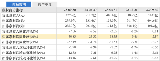 今年前三季度,浦发银行实现营业收入1328.15亿元,同比下滑7.56%;实现归母净利润279.9亿元,同比下滑30.83%。