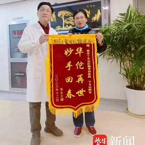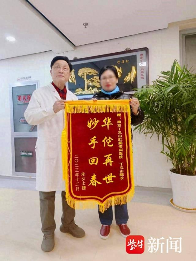 近日,家住南京三牌楼的一位五十岁患者朱女士,来到南京丁义山专科医院,将一面印有“华佗再世,妙手回春”锦旗亲手献给丁义山院长,表达她的一份诚挚谢意: