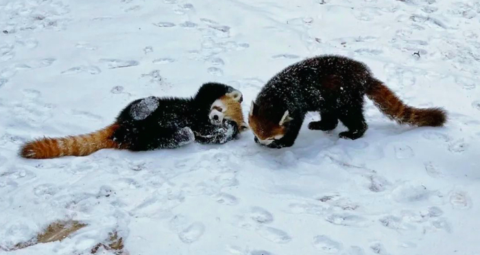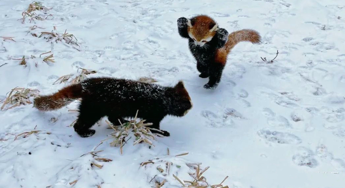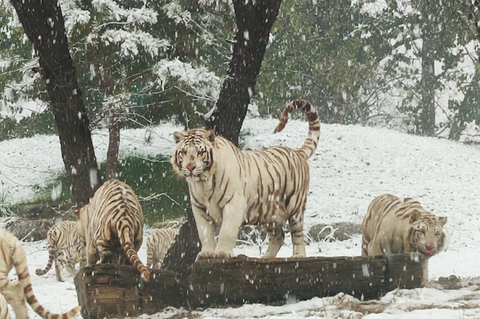 老虎漫步、小熊猫打滚儿……野生动物园里,动物们雪中撒欢儿