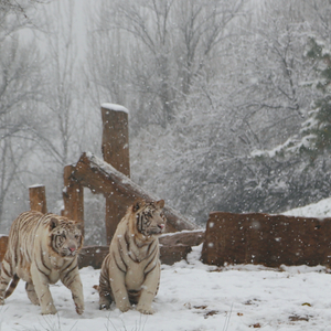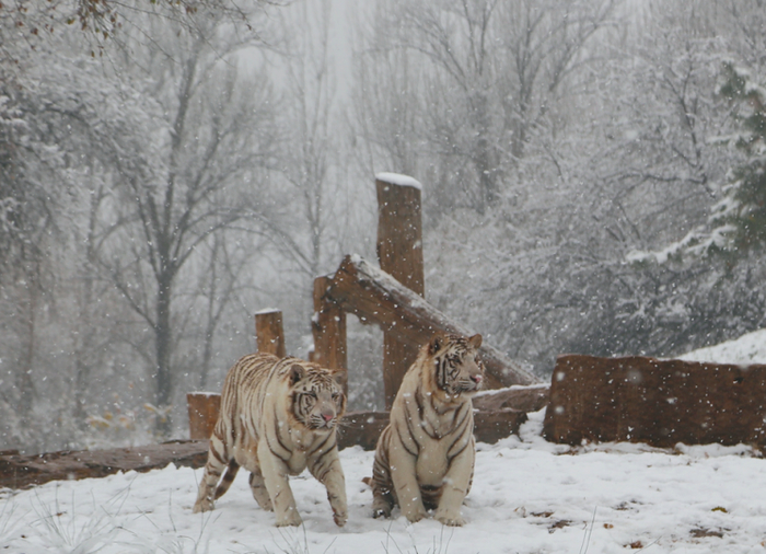 走进园内,雪后的野生动物园银装素裹,一片洁净,活跃在其中的动物朋友们给宁静的雪景增添了几分灵动。在“猛兽体验区”,几只白虎开启了雪中漫步模式,在雪地里来回踱着步子,所经之处留下一串串脚印,还不时低头与雪花来个“亲密接触”。一旁的“邻居”东北虎则更显兴奋,2只东北虎在雪中灵活地跃动着身子,相互追逐打闹,玩得不亦乐乎。