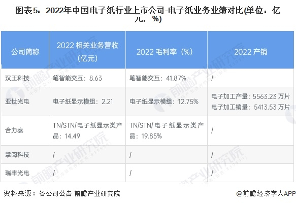 从上市公司电子纸相关营收来看,2022年,合力泰的电子纸相关业务营收超14亿元;从上市企业相关业务毛利率情况来看,汉王科技电子纸业务的毛利率相对较高。