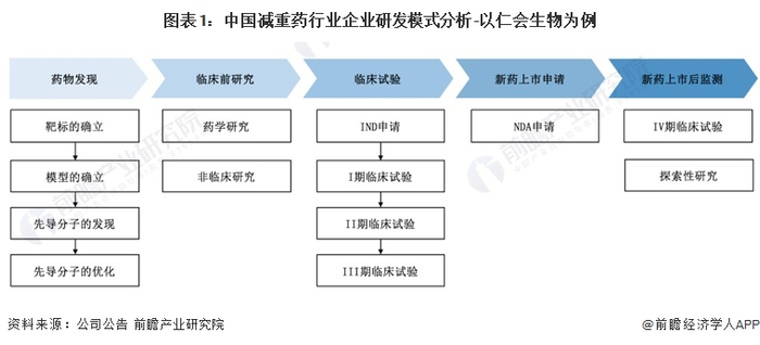 由于减重药新药研发时间周期长、投入巨大、技术难度高,存在较高的风险,因此医药公司对新药开发的选择及开展均非常慎重。以仁会生物为例,公司新药研发并非单纯基于技术领先的角度,而是通过分析某个疾病领域未被满足的临床需求以及市场上现有疗法和药物的缺点,并结合公司发展战略、知识产权状况、竞争者情况、技术难度及工艺成本来确定具体的研发方向。仁会生物减重药研发主要流程如下所示: