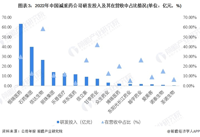 从我国减重药代表性企业研发投入来看,恒瑞医药研发投入最高,超60亿元,石药集团、信达生物紧随其后;从研发投入在营收中的占比来看,信达生物研发投入在营收中占比超58%,甘李药业超40%,而恒瑞医药、翰宇药业、信立泰研发投入占比均超过25%。