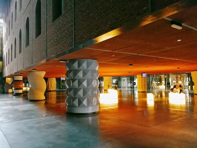 建筑内部形成的室内广场相当开阔,三个立方体下的柱子群是孩子们捉迷藏、嬉戏的好去处。这些柱子造型各异,象征着人类文明的不同文化、建筑和宗教,柱子材质也见证了人类历史的发展,有砖、木、青铜、石头、水泥和钢铁等。