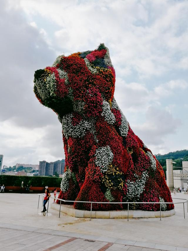 一侧的景观步行桥是欣赏古根海姆博物馆和内维翁河的不错角度,曲折桥身兼顾通行和观景台的作用。在这里不但可以看到博物馆,还能看到广场上的“小狗”。这个由鲜花做成的“小狗”有12米高,实际上是不折不扣的“大狗”,它由美国艺术家杰夫·昆斯创作,堪称毕尔巴鄂人的“团宠”,也是游客最热衷拍照的地方之一。
