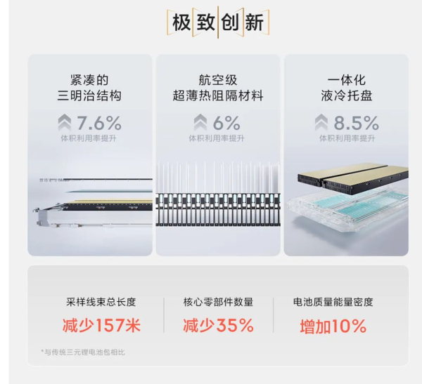 相较传统设计,金砖电池的采样线路总长度也缩短了157m,核心零部件数量减少35%,电池质量能量密度也提升10%以上。