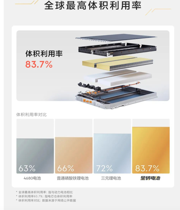 值得一提的是,金砖电池的体积利用率达83.7%,是目前全球体积利用率最高的动力电池,此前,行业内电池包体积利用率最高的是宁德时代的麒麟电池,也不过72%。