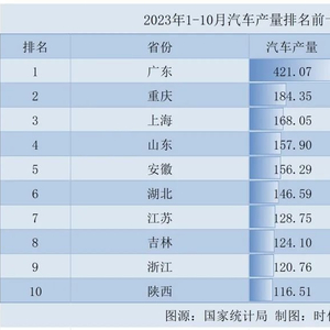 今年1-10月,全国汽车累计产量2366.3万辆,同比增长4.9%。这其中,汽车产量排名前十名的省份占据了全国汽车产量的“半壁江山”,依次为广东、重庆、上海、山东、安徽、湖北、江苏、吉林、浙江和陕西。