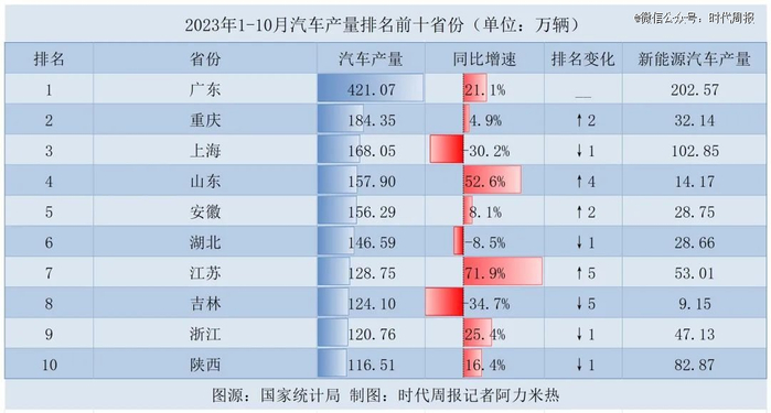 与此同时,山东和江苏的汽车产量增长迅猛,同比增长52.6%和72.9%,排名上升4位和5位,分别位列第四和第七。而汽车产量长期排在全国前三的吉林,今年前10个月汽车产量同比下降了34.7%,跌至第八名。
