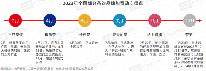 据红餐产业研究院不完全统计,2023年,传出加盟新消息的茶饮品牌共计5家,其中奈雪的茶在7月正式开放加盟。茶饮品牌集体开放加盟,反映的是品牌低成本快速扩张的迫切发展需要。