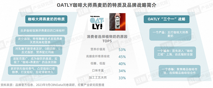 红餐产业研究院了解到,具有植物基属性的燕麦奶,严选进口高品质燕麦,可以满足乳糖不耐受的消费群体需求,也蕴含口感顺滑轻盈、成分健康、营养配比均衡等特质。而得益于在国内实施的“三个一”市场战略,OATLY成功地将燕麦奶引入中国市场,自此推动了新植物基品类的建立和发展。