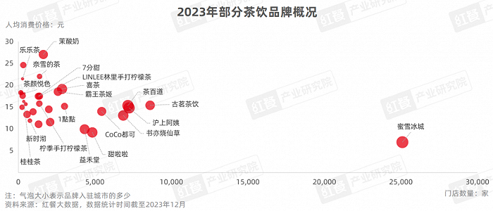 据红餐大数据,截至2023年12月,不少茶饮品牌的门店数在2,000家以上,蜜雪冰城以超过2.5万家的门店规模一骑绝尘。古茗茶饮、沪上阿姨、茶百道、书亦烧仙草等4个品牌的门店数也在6,000家以上,万店“入场券”的争夺大戏一触即发。