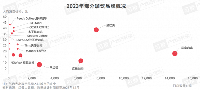 品牌竞争格局方面,咖饮品类已经发展成星巴克和瑞幸咖啡引领下的“两超多强”局面。瑞幸咖啡在2023年6月成为全国首个万店咖饮连锁品牌,据红餐大数据,截至2023年12月,瑞幸咖啡的门店数已经突破了1.4万家。