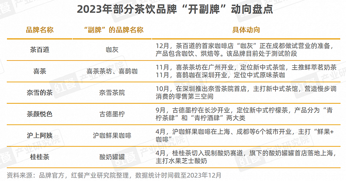 2022年,茶饮品牌扩充业务线,开出了不少子品牌,例如茶颜悦色的鸳央咖啡、小神闲茶馆,甜啦啦的口口椰、卡小逗,7分甜的轻醒咖啡等,相继在茶饮、咖饮、茶馆等领域发力。2023年,茶饮品牌在“开副牌”上热情不减,例如喜茶、奈雪的茶、茶颜悦色、茶百道、沪上阿姨、桂桂茶等,均有开出各自的子品牌。