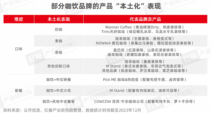 口味上,奶咖、果咖、茶咖等均是本土化杰作,如瑞幸咖啡的生椰拿铁、Manner Coffee的黄油啤酒Dirty等。配餐上,不少品牌推出中式餐食,如M Stand的肉桂麻花、Pick ME 咖啡&热轻食的卤肉饭等。