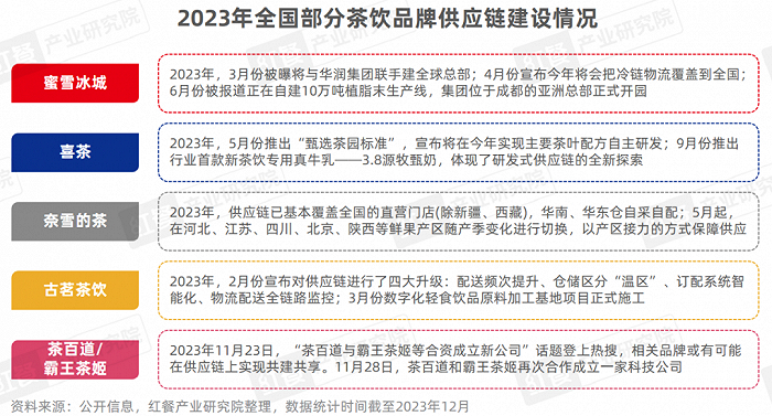 2023年,茶饮品牌加强供应链建设,蜜雪冰城、奈雪的茶、古茗茶饮等品牌都在进一步夯实自身供应链。在茶饮赛道竞争愈发激烈的当下,供应链体系建设是品牌降本增效、赋能扩张的可行之策。