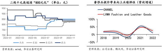 超高端:提价之下茅台继续稳健领跑。回顾茅台21世纪9次提价史,对其业绩均有极大的提振作用。其中,2011年1月公司将飞天出厂价由499元提升至619元,当年公司营收大幅提升58%。统计显示,公司9次提价直接作用年份的营收增速(27%)显著高于未提价年份(21%);对比同样具备奢侈品属性的CHANEL和LVMH,后两者在最近五年频繁提价,业绩显示提价反而给予公司营收更多向上弹性,我们认为2024年在第10次提价的作用下,公司业绩将得到明显支撑。