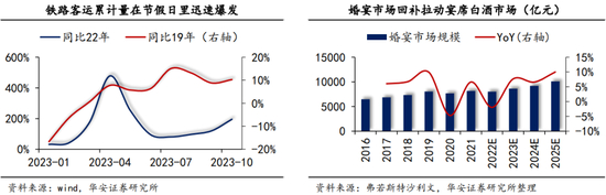宴席:从需求端来看,放开之后第一年人员流动大幅增加,铁路客运量显示同比去年翻倍式增加,3月开始较2019年呈现加速增长,带来了大量以婚宴为主的需求回补;从供给侧来看,酒企纷纷加入宴席战,提供了大量C端活动刺激宴席消费。