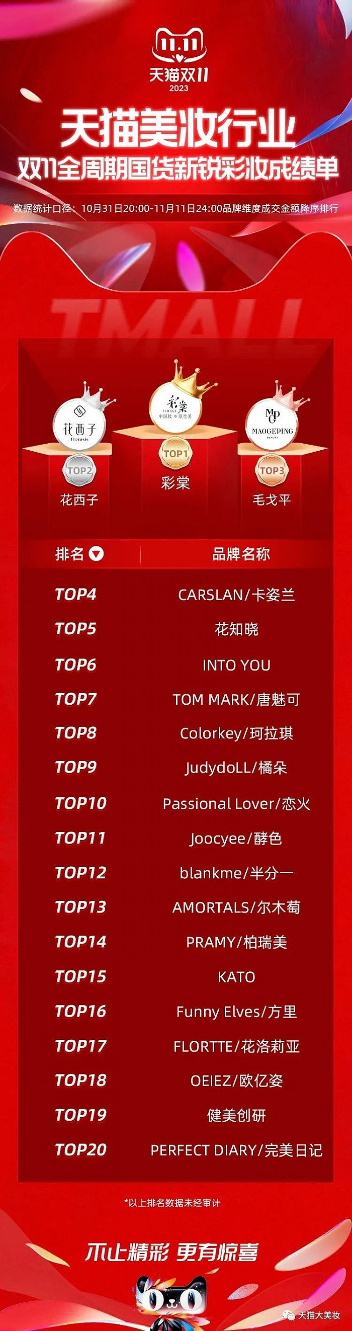 与护肤赛道的竞争相似,彩妆的竞争也越来越进入规模化竞争的轨道中。我们来看今年天猫双11的彩妆榜单:
