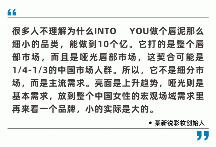 02)质地,虽然有其他小众颜色出现,但毕竟红色是中国市场的最大基本盘,而颜色总有尽时,所以近几年的竞争逻辑转到了质地,这个也有一个轮回。比如前几年消费者更多追求哑光的质地,体现出更自然的妆感,INTO YOU在唇泥这一质地的创新吃到了这一波最大的红利;如今趋势如轮回般来到了亮面的需求侧,而通过配方和制作工艺的创新,将亮面质地在口红上做到极致的酵色,成功拿下了大量唇部亮面质地的市场。