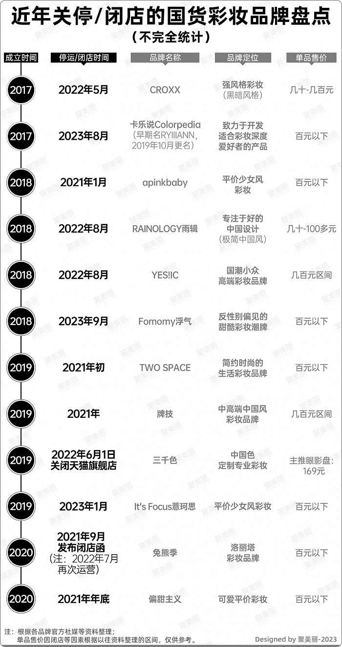 当然,市场是残酷的,规模品牌掌握更多的市场主导权,意味着后梯队的品牌面临更严峻的竞争形势,倒下的品牌远比上位的品牌多得多。在10月份的聚美丽文章《多个初代新锐“消失”,国货彩妆前路在哪?》中,我们曾经不完全统计过2018年至今关停的彩妆品牌,以及分析倒下的原因。