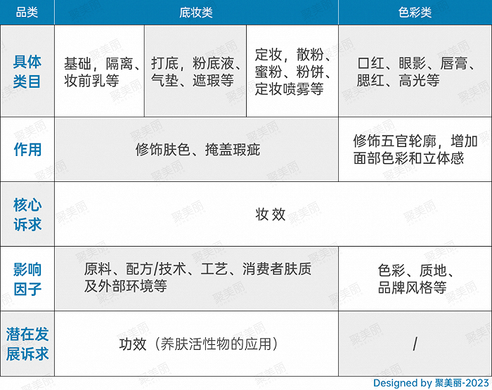 再回到彩妆品类本身,底妆类与色彩类,一个理性成分更浓一些,一个感性成分占主导,所以两大细分品类在产品对消费者的影响因子层面也有区别。