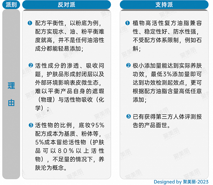 反对派的具体声音,可以搜索参看美妆科普博主-真魅博客早在2020年就发表的文章《靠养肤粉底养肤?这又是个忽悠?》(表格中观点还参考了最新供应链方和品牌方意见)。支持派中,方里认为底妆的类护肤心智可以走功效路径,因为消费者对于自身的皮肤健康愈加关注,方里今年也宣布了其中美实验室和投资方贝泰妮集团的研究所进行战略合作,开发敏感肌方向的底妆产品;而供应链的代表太和生技孵化器负责人郭瑜透露,太和生技已经在跟客户推广一款拥有祛痘功效人体评测报告的粉底液。
