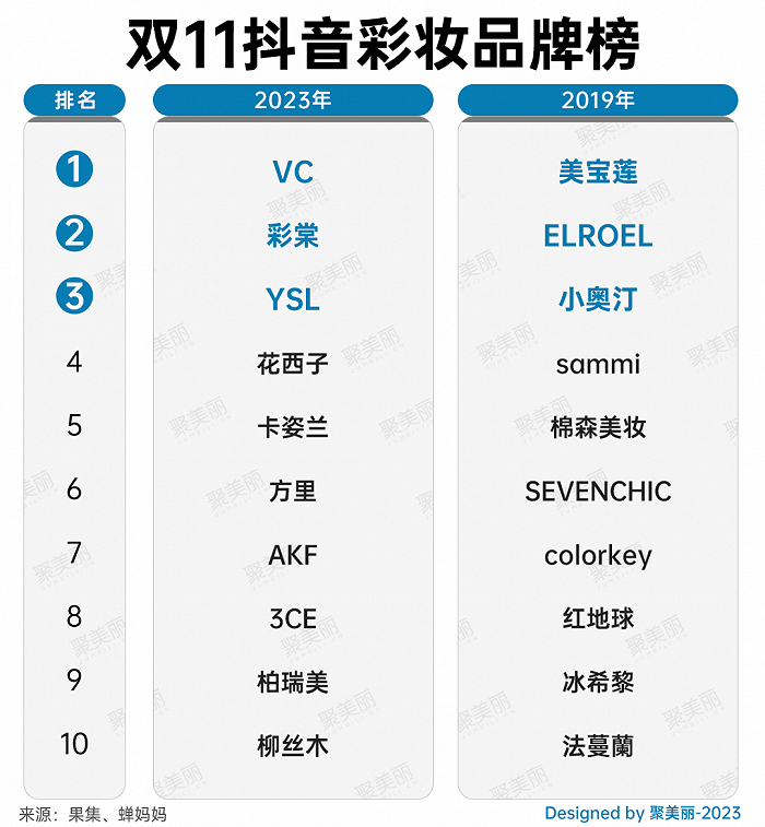 这样的规模品牌格局,不仅是在天猫这样的成熟经典平台,包括在抖音这样的快速发展平台也已经十分明显,国际品牌逐渐入场,新锐品牌也明显更迭,更具品牌属性,进入TOP 10的门槛从几百万上升到5000万,可以预见,到2024年再看抖音的彩妆榜单,可能雅诗兰黛的彩妆、兰蔻的彩妆、魅可、玫珂菲等传统天猫平台的豪强也会逐渐出现在抖音的TOP 10榜上(有没有看出来哪个曾经的外资头部消失在了天猫、抖音双TOP榜单中?)。