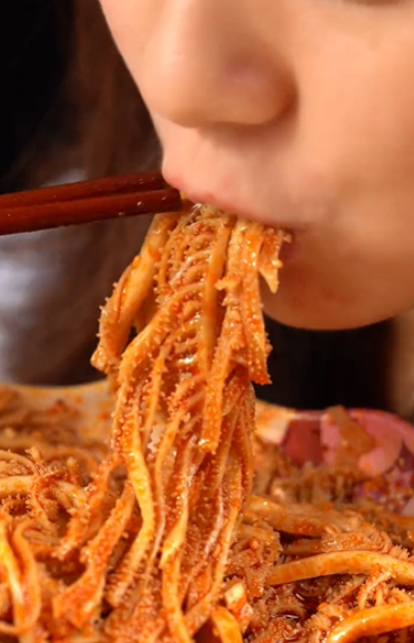 斯文一点的小姐姐用筷子挑起三两根涌入口中。