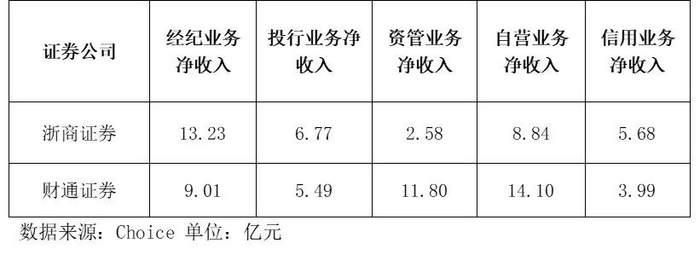 从各项业务发展来看,浙商证券在经纪业务、投行业务上相对具有优势。财通证券的优势则体现在资产管理方面。