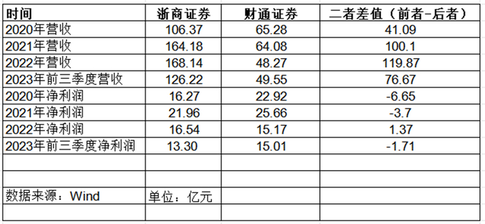 Wind数据显示,2023年前三季度浙商证券实现净利润13.30亿元,而财通证券是15.01亿元。2020年-2022年,浙商证券的净利润分别为16.27亿元、21.96亿元、16.54亿元。财通证券相对应的分别是22.92亿元、25.66亿元、15.17亿元。