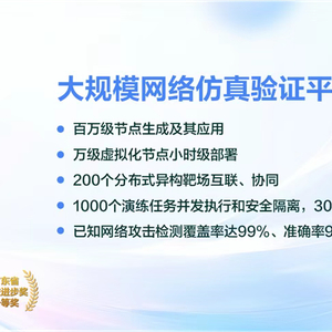 大规模网络仿真验证平台的研发面临两大世界难题。首先是如何基于有限的软硬件及网络资源极大化仿真复杂且无边界的互联网,其次是如何在攻防演练过程中,全面、准确、实时地检测上亿种网络攻击,并科学评估网络攻防效能。
