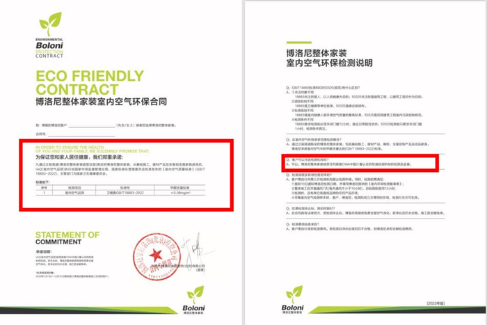 消费者刘先生投诉称,在签订合同前消费者并未被告知“如达不到国家标准安排上门除醛”,且合同为“公司统一标准,不得修改”,其中没有关于环保方面的细则。消费者只是在检测出甲醛超标后拿到了一份“2023居室环保承诺书”。关于空气环保,博洛尼作出“郑重承诺”:凡通过正规渠道(博洛尼整体家装直营店面)购买的博洛尼整体家装,从基础施工、建材产品及安装到全屋家具进场后, IAQ(室内空气品质)执行由国家市场监督管理总局、国家标准化管理委员会批准发布的《室内空气质量标准》(GB/T 18883-2022),主管部门为国家卫生健康委员会,甲醛含量标准为≤0.08mg/m³。