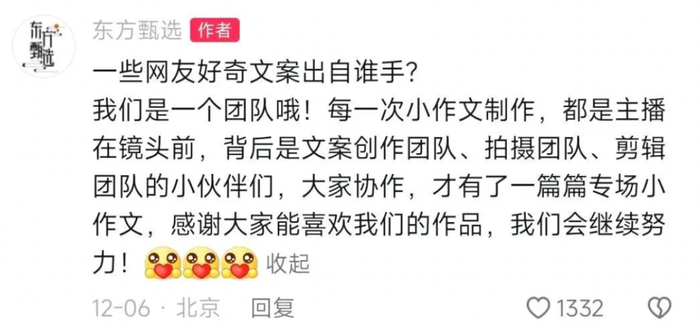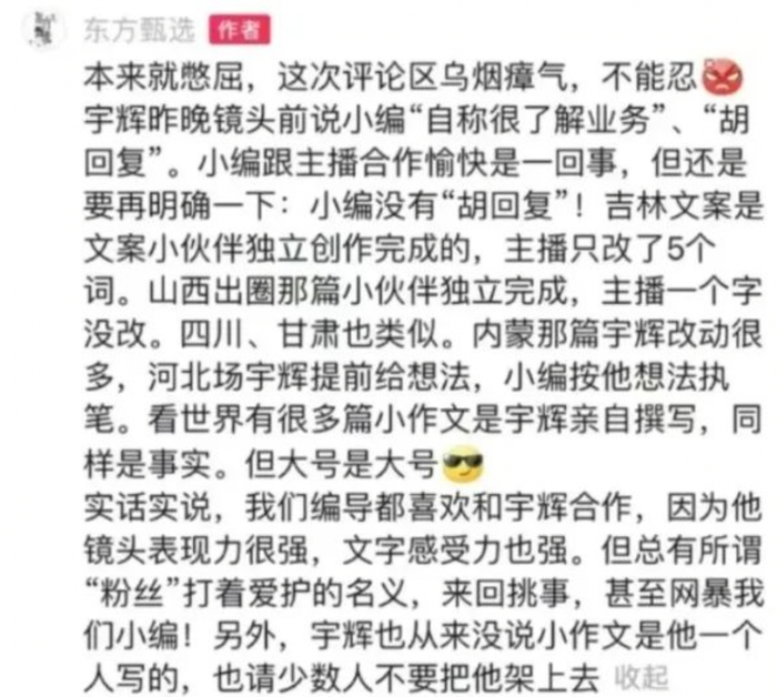 东方甄选的小编突然高调邀功,说董宇辉最有特色的小作文都是文案团队写的。
