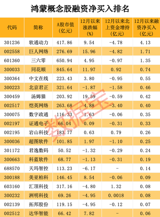 资金面上来看,12月以来融资净买入超亿元的有3只,分别是软通动力、巨人网络、三六零。同一区间内,按照成交均价计算,北上资金净买入超亿元的是智度股份、汇顶科技、新国都。