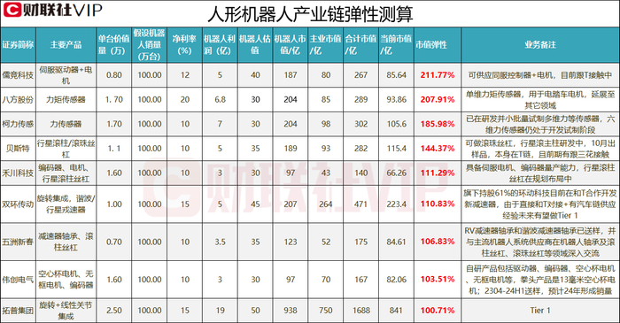 据财联社VIP盘中宝?数据栏目此前梳理,以假设100万台人形机器人销售量计算,2家A股产业链上市公司市值弹性超200%,分别是儒竞科技和八方股份。此外还有7家上市公司市值弹性超100%,包括柯力传感、贝斯特、禾川科技、双环传动、五洲新春、伟创电气、拓普集团。其主要产品、单台价值量、净利率、机器人利润、机器人估值、市值弹性等情况如下图所示: