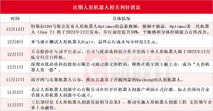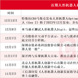 财联社讯 人形机器人催化剂不断,特斯拉CEO马斯克周三发布人形机器人Optimus的最新视频。而“人形机器人第一股”优必选于12月1日通过港交所聆讯。据财联社不完全梳理,近一个多月人形机器人利好消息汇总如下图: