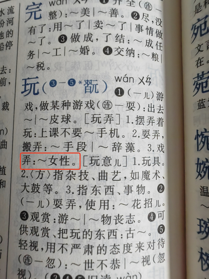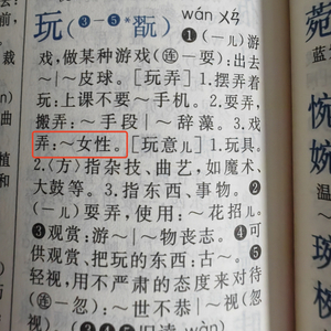 第500页,“玩”字的注释组词“玩弄女性”;