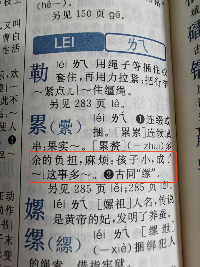 第284页,“累”字的注释造句“孩子小,成了累赘”;