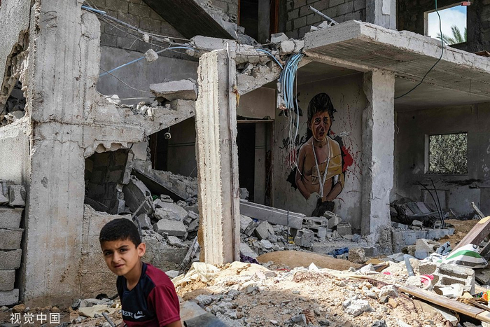 当地时间2023年6月14日,巴勒斯坦加沙地带,一个男孩站在因上月巴以冲突而损坏的房屋废墟前。