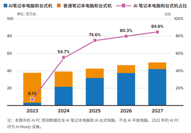 IDC预测,AI PC在中国PC市场中新机的装配比例将在未来几年中快速攀升,将于2027年达到85%,成为PC市场主流。