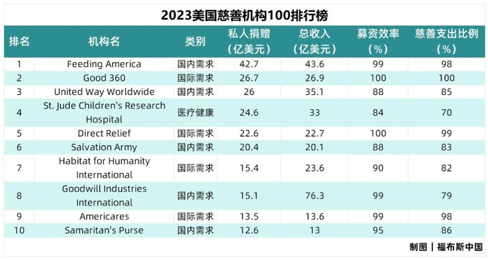 今年登上本榜的善款门槛——也就是排名第100位的机构所收到的捐赠额为1.86亿美元,高于2022年的1.81亿美元。