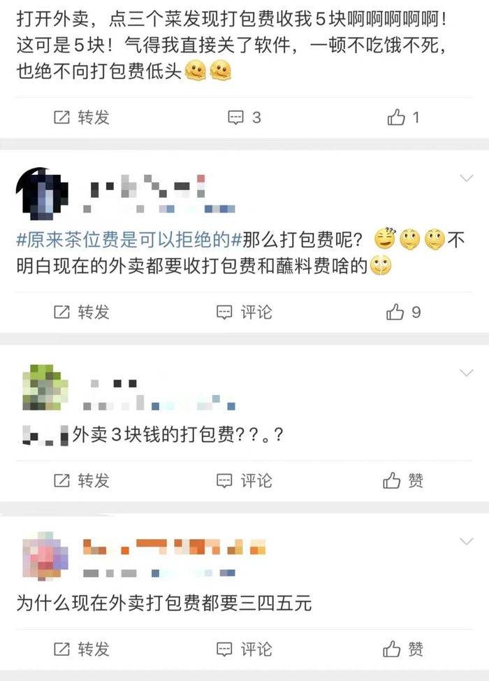 有网友在社交媒体吐槽,“点麻辣香锅,几个菜炒一起,打包费要5块,是什么高级打包盒要这么贵?”