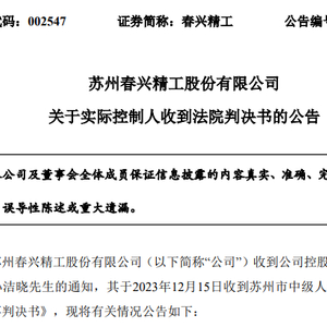 春兴精工(002547)12月15日晚间公告,根据苏州市中级人民法院出具的《刑事判决书》,公司控股股东、实控人孙洁晓犯内幕交易罪,判处有期徒刑三年,缓刑四年,并处罚金40万元。