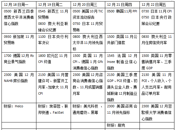 本周看点颇多,美联储最关注的通胀指标将出炉,关注数据对降息前景的影响。在经济意外下滑后,英国11月消费者物价指数(CPI)是否会重燃政策宽松希望。耐克将发布最新财报,外界密切关注消费者开支的走向,作为紧缩周期末期经济走向的重要参考因素。