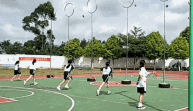 这种高杆绣球,看着玩法很简单,把手里的小绣球扔进圈内就可以。不过满分的标准并不简单,同学们得在两分钟内投进13个。