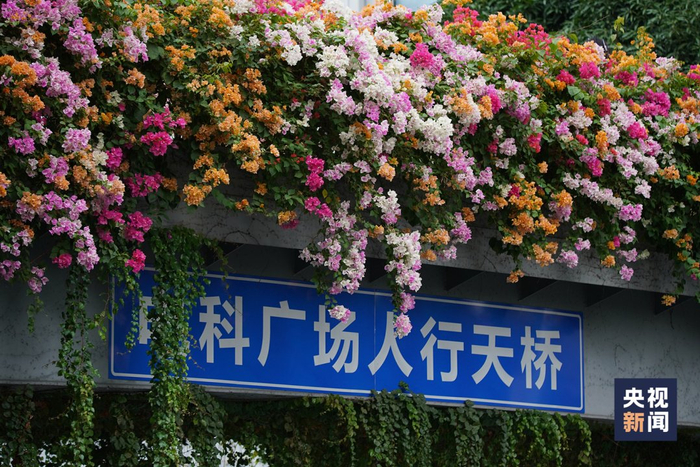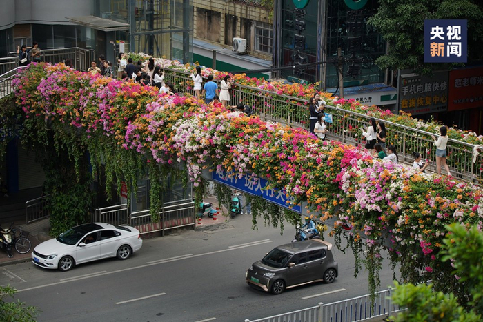 星湖路上火出圈的人行天桥,五颜六色的三角梅簇拥着,犹如五彩“花瀑”,浪漫唯美。