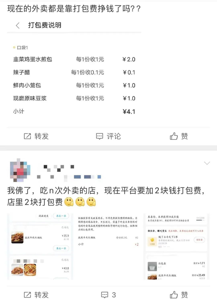 “现在外卖都靠打包费挣钱吗?”“点了3个串收我6块钱打包费。”